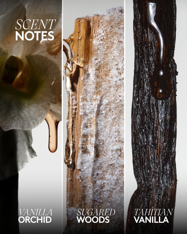 Flores de Baunilha: Conheça o lado mais suave do sexy. A Baunilha do Taiti e a Orquídea de Baunilha se combinam com Fluffy Musk e Sugared Woods para aquela mistura certa de sensual + doce que funciona bem a qualquer hora do dia.